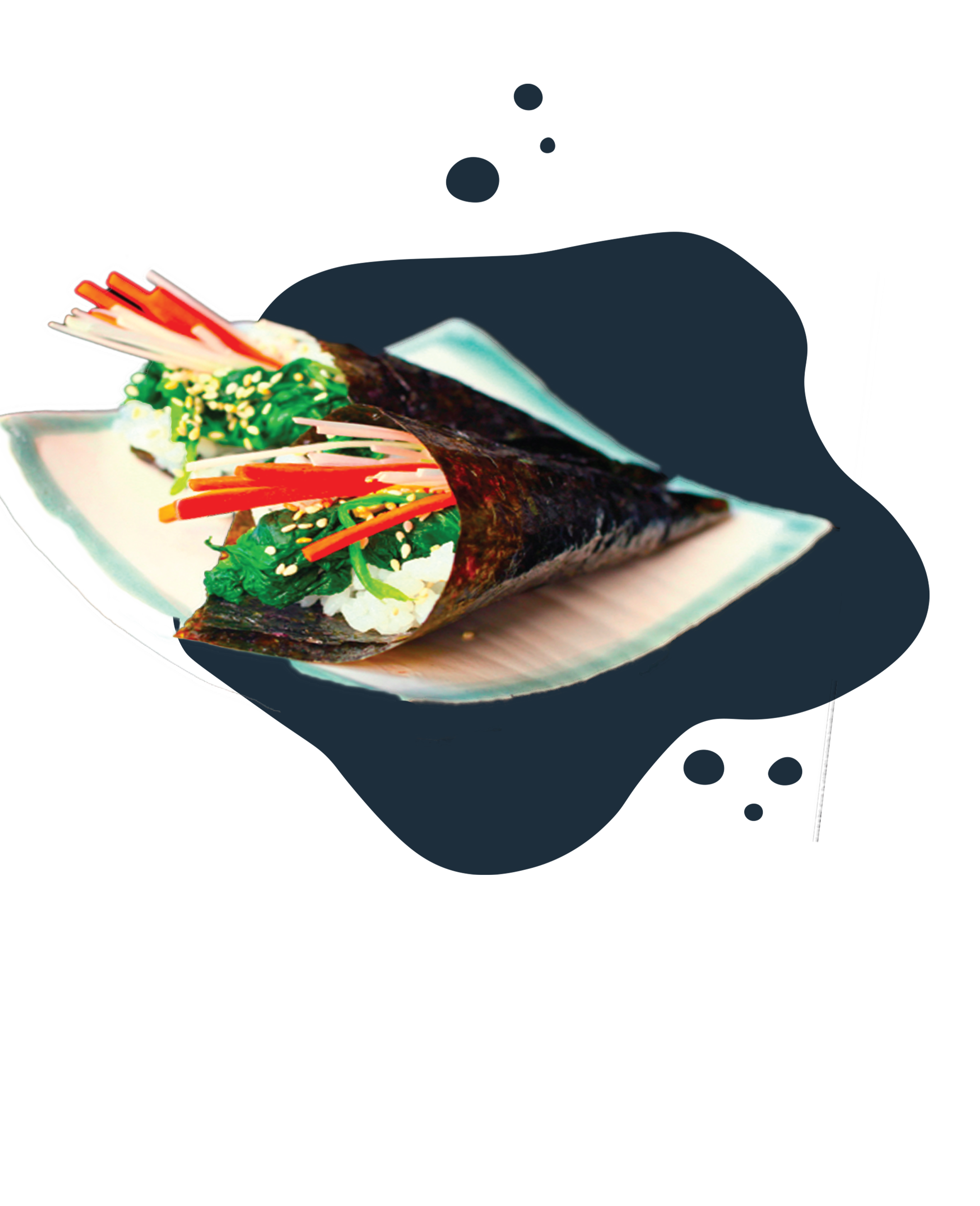 Sashimi-grade fish and sliced veggies/mango.If you are vegetarian you can still make Temaki Sushi with vegetables or use cooked ingredients such as Shrimp Tempura, grilled unagi, or even Chicken Teriyaki and Chicken Kaarage!